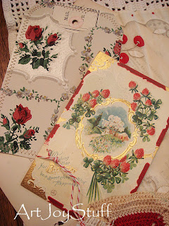 Each begins with a pretty antique postcard , and finishes with one of my handmade tags.
